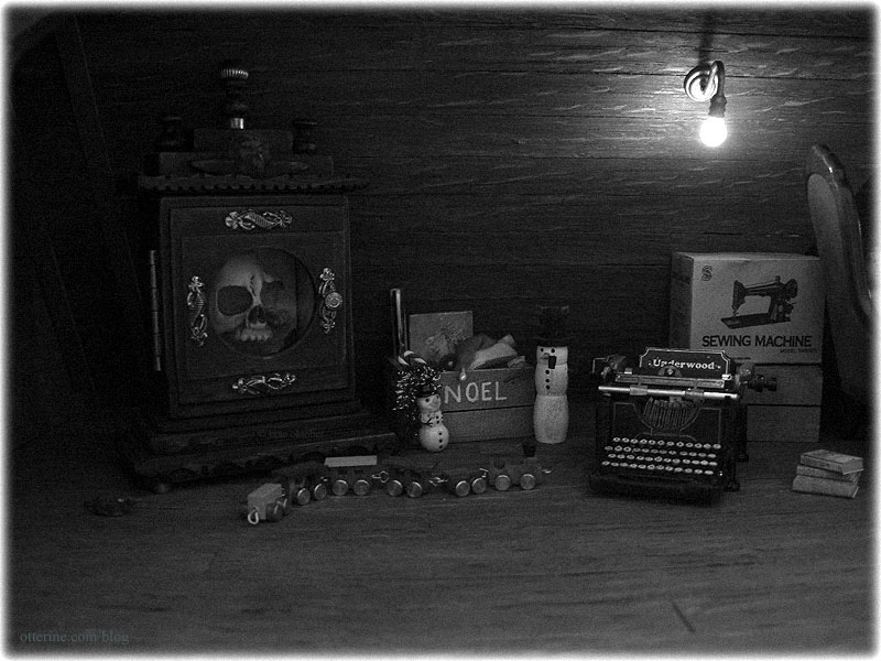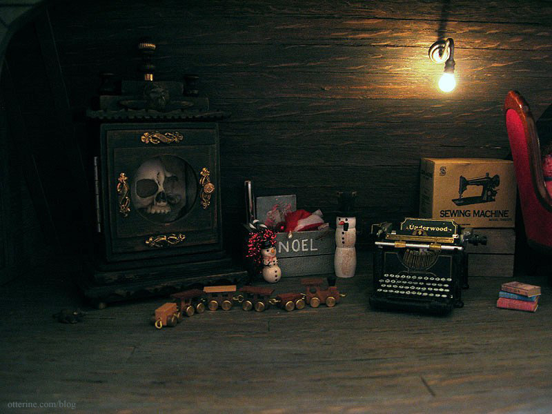 From the left, there is a mouse from Sussex Crafts next to Tony‘s catacombs case clock. The wood and brass train is from a vintage lot of miniatures I bought on craigslist. The Christmas box is from M Carmen for Caterina’s holiday swap. I purchased the two snowmen. The sewing machine box is from Four Little Walls. It’s sitting on a crate with some random books I made in front.  :]