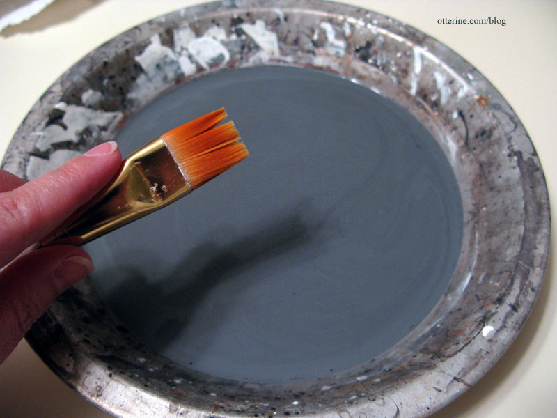 On the exterior, I used diluted washes of grey, black and brown acrylic paints to achieve the look of old, weathered wood that will show under the crackle effect of the exterior paint. This staining process takes a few coats to achieve a deep color, so I always start with a modest amount of paint and a lot of water mixed in a standard size pie tin.