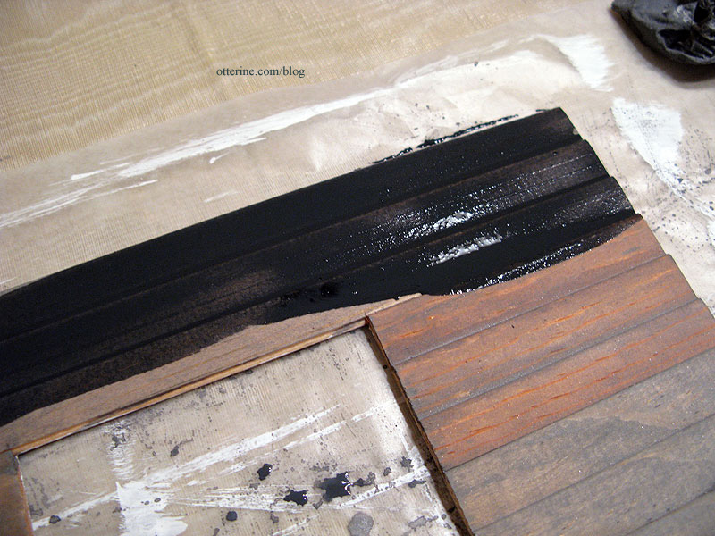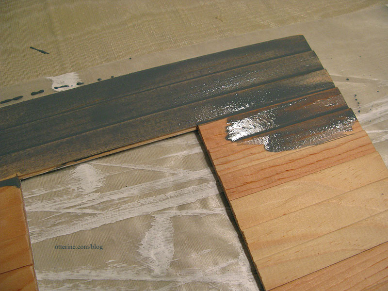 I brushed this dark mixture over only the red areas and left it on full strength. Some boards needed a lot and one didn’t need it at all. Light areas are fine, but red areas will clash with the weathered effect.