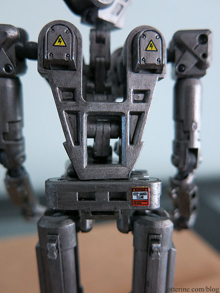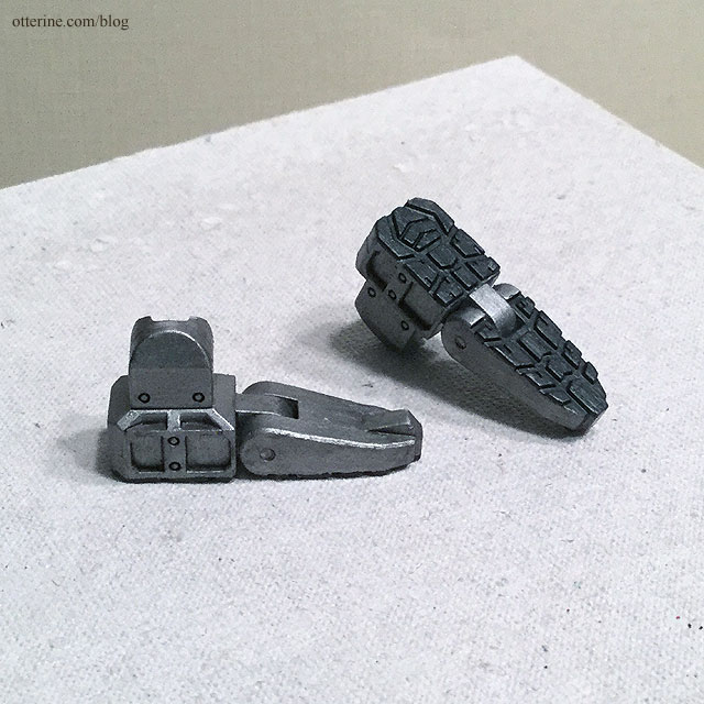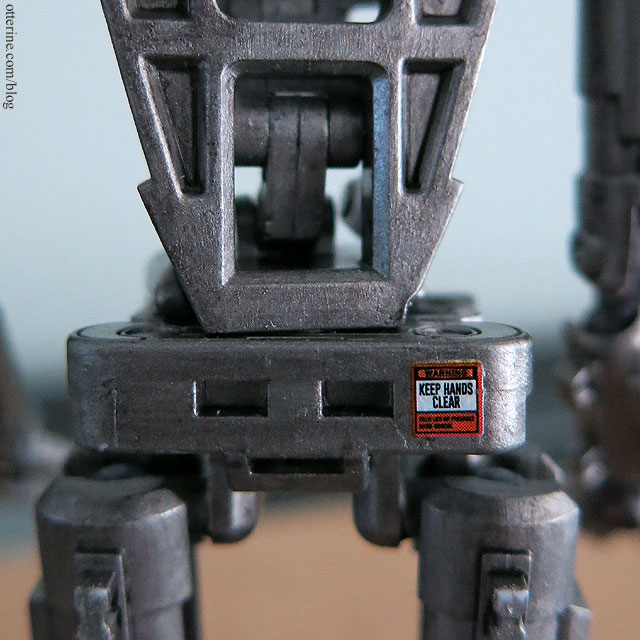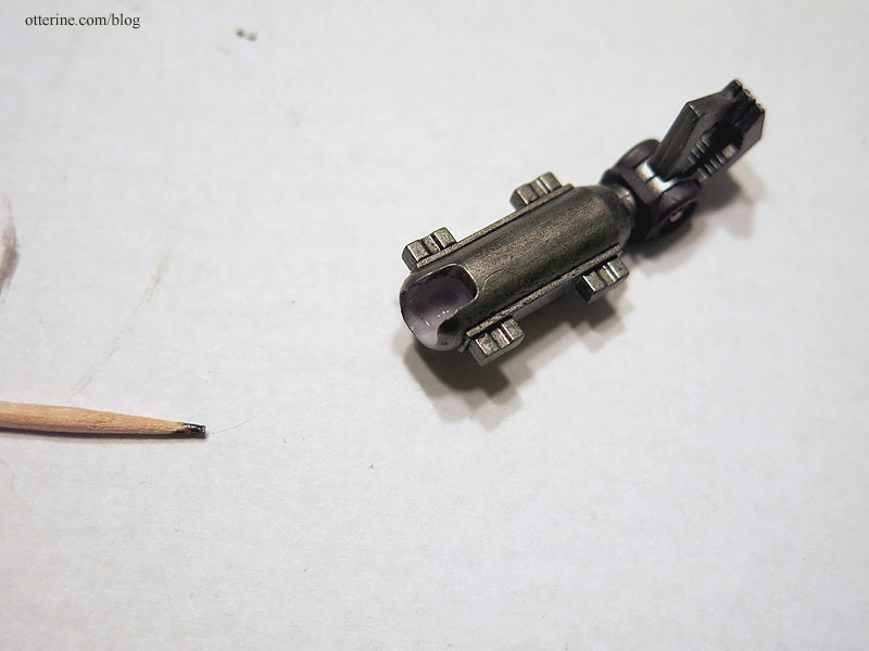 After dying the plastic, he ended up grey-purple, grey-brown and dark grey. Overall, the results were a great middle color for me to work on from there. In an unexpected but promising turn, the joints turned darker than the body and that would save me time trying to detail those. I ended up permanently gluing the chest plate in place on the torso since it would no longer stay in place. Bert will never revert to his folded up self, but I wouldn’t want to risk damaging the paint in the end anyway.