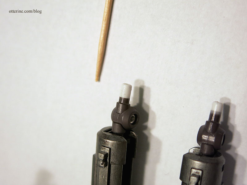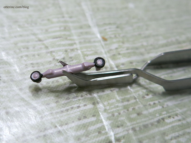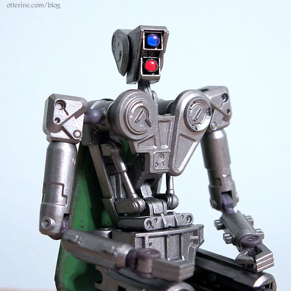 The “eyes” for the Robox were separate parts, which made them easier to customize. Well, I think one was an eye and the other a mouth, but I just refer to them as eyes and figure the speakers for talking are built in. :D I painted the outer rims black, leaving them on the sprue until I was ready to glue them in place.