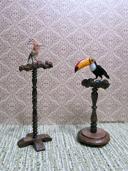 To make the perches, I used pieces from the old tree branch I used in The Artist’s Studio. The wood is stained to match.