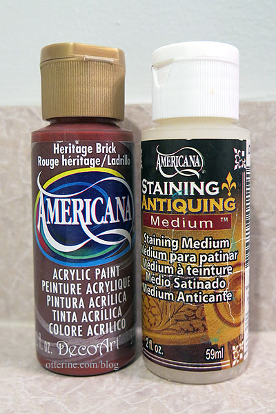 I painted the chest a base color of Heritage Brick mixed with Staining Medium, both by Americana.