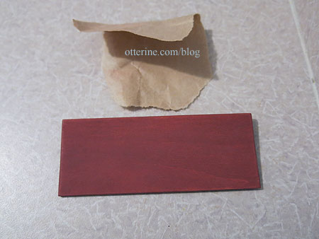 It’s a rusty red that will fit with just about any décor. I lightly sanded the chest with a scrap of paper bag material to smooth the surface raised by the paint application.