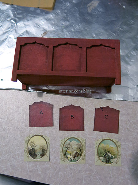 I found wonderful art on The Graphics Fairy to add to the chest. I have hand painted designs previously, but I wanted to give this technique a try. I always print a few copies of the final images and then cut the panels to fit until I am happy with the end result.