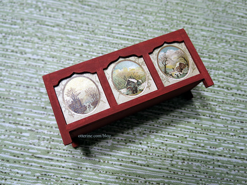 I didn’t worry too much about being precise because the final finishing will cover minor mistakes and the shadow of the overhang will help disguise as well. I skipped the side panels, keeping the focus on the front. The panels are glued in place using MiniGraphics Wallpaper Mucilage and covered in a thin layer of Delta Ceramcoat Satin Varnish.