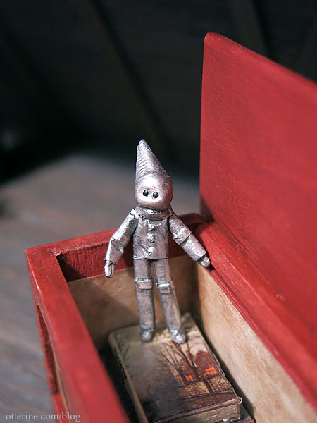 Now I have a delightful country blanket chest for books and other treasures. The books are from L. Delaney, and the tin man doll is from Sir Thomas Thumb.