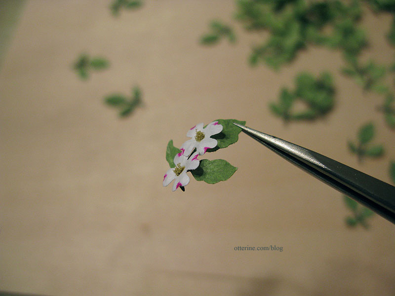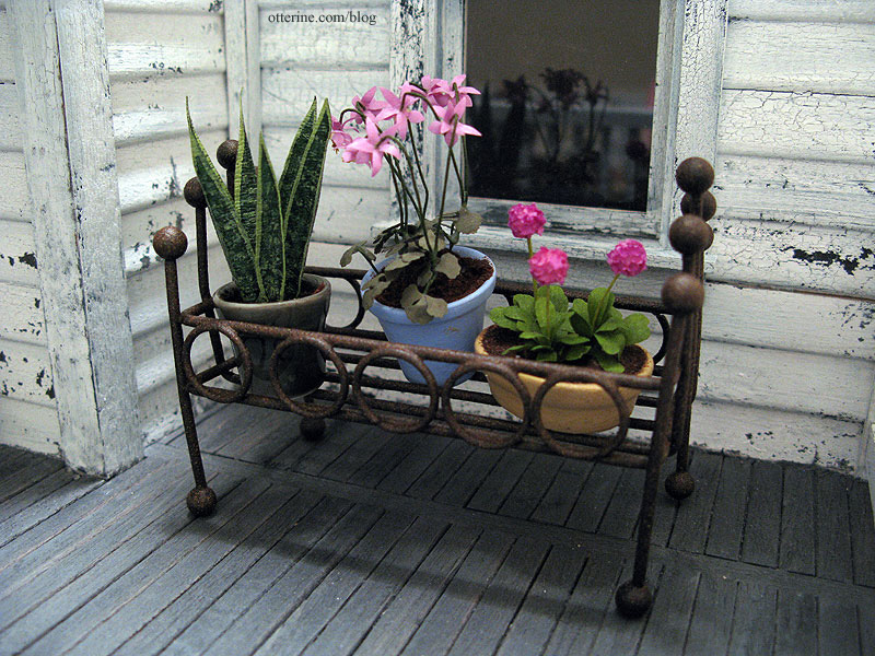 I also showed the planter and plants in earlier post, though I didn’t end up using one of the plants I made. I really like the way this small potted garden fills the space without taking over. The watercan is from Celtic Juju. The plants are made from a combination of kits from The Miniature Garden and Bonnie Lavish with added greenery from A Little More in Miniatures.