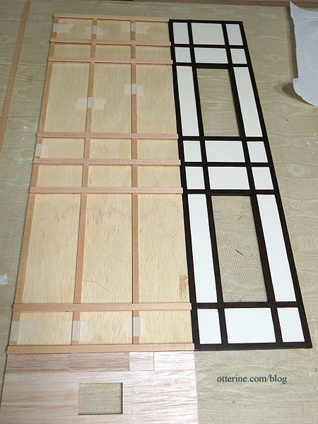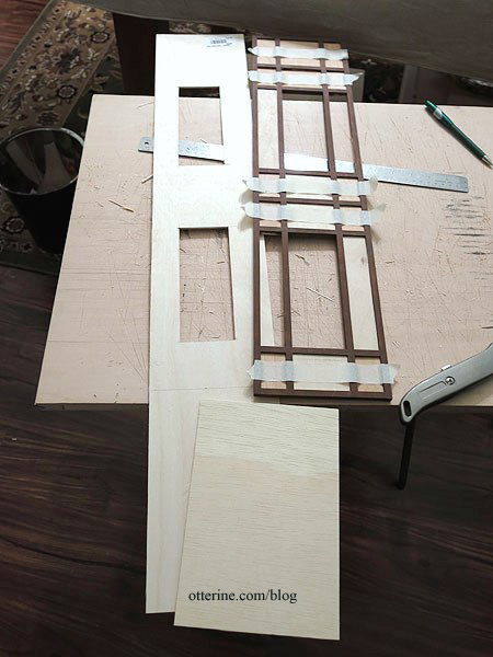 I cut the horizontal beams to abut the back vertical beam so I wouldn’t have to spackle the joins on the back surface. I cut filler pieces for the new grid from 1/16″ thick basswood. Cutting thinner wood is easier and faster. That and the lower cost of supplies are the reasons I switched to smaller thicknesses for the side walls.