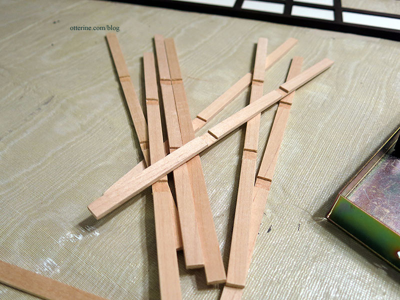 Since I added windows to the side addition and the kit also has the wrong amount of pre-cut pieces for the existing windows (the amount listed in the instructions is incorrect for the amount needed), I bought some additional lengths of wood from National Balsa when I placed my large order. I stained all the pre-cut pieces and two of the additional lengths I bought using Rust-Oleum Ebony.