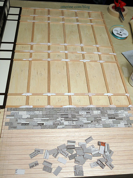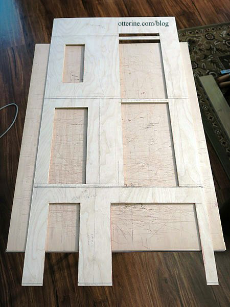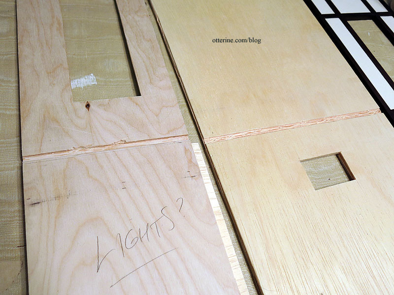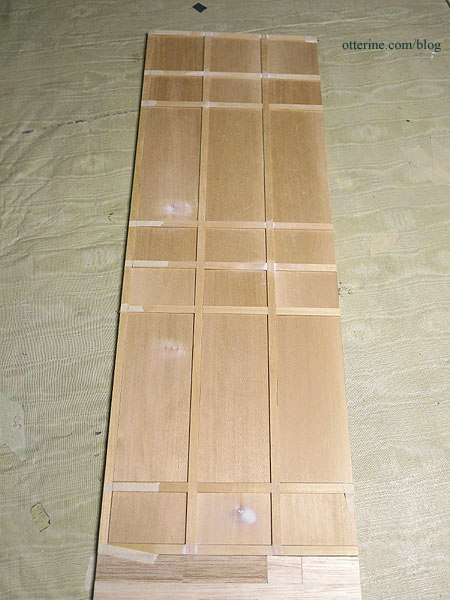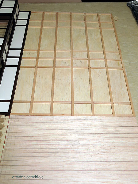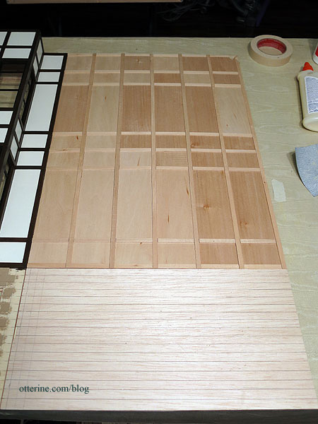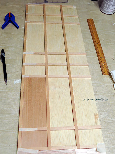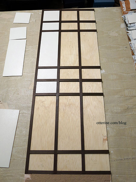 I’ve filled a few knots and joins in the beam structure so the grid and filler pieces are ready for painting. This particular wall likes to warp, so I ran the plywood board under water and pressed it flat to dry for several days. When it is not on my work table, it is pressed under magazines and paint cans. I won’t let it loose until it’s time for final assembly, which should fix the warp permanently.