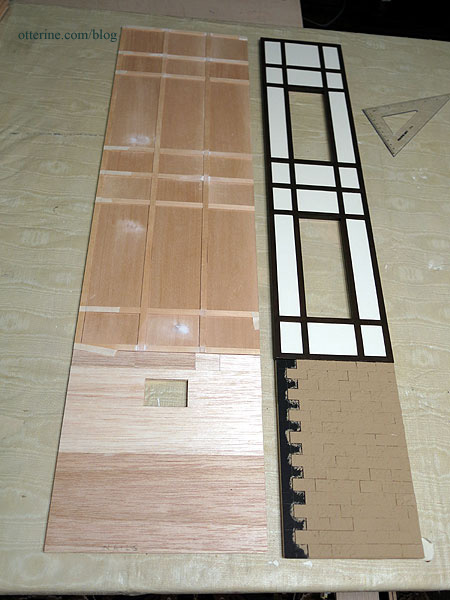 Continuing work on the bay window section. The glass is to be placed on top of the wood pieces and an identical set is glued in place over the glass to keep it secure, but I need to create the stained glass inserts first.