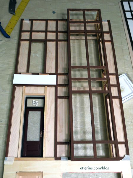 Continuing work on the bay window section. After assembling the front wall, I added the trim to the interior upper window.
