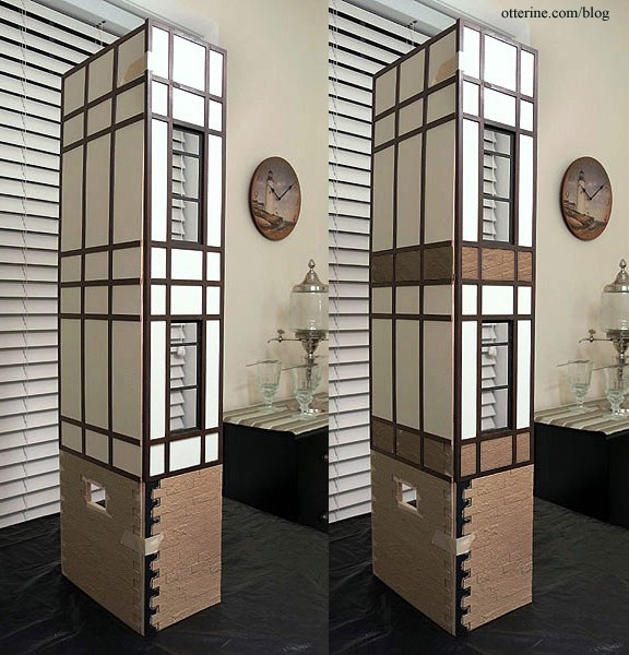 I added the black window frames to the addition front wall. These had to be cut from lengths of wood I purchased since there was only so much wood trim included in the original kit. I glued the bottom stone portion to the top grid assembly.