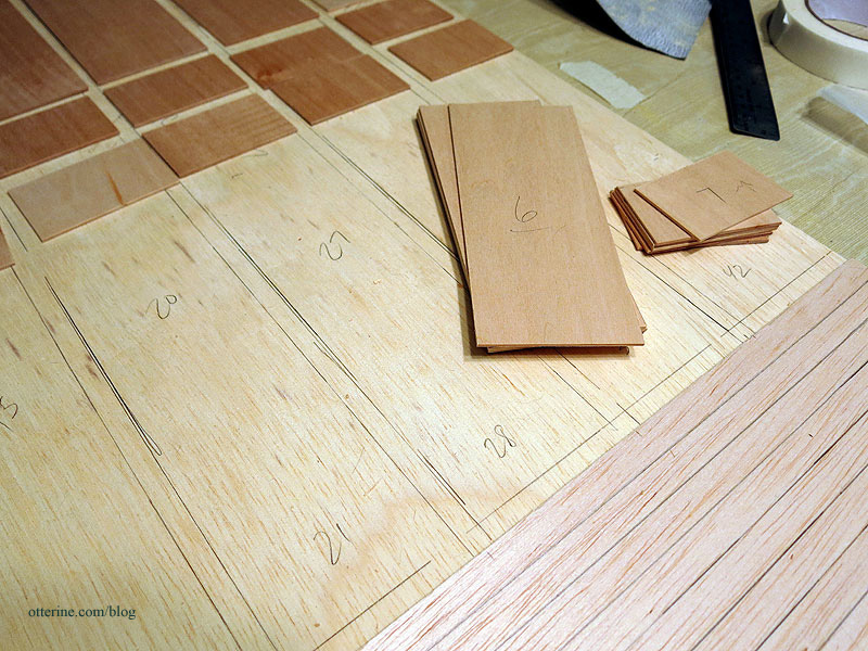 I continued cutting the basswood parts, fitting around the backer board cross sections. I left these beams across the bay window section to support the floor boards. Since my basswood sheets were only 3″ wide, I had to piece the middle portion.