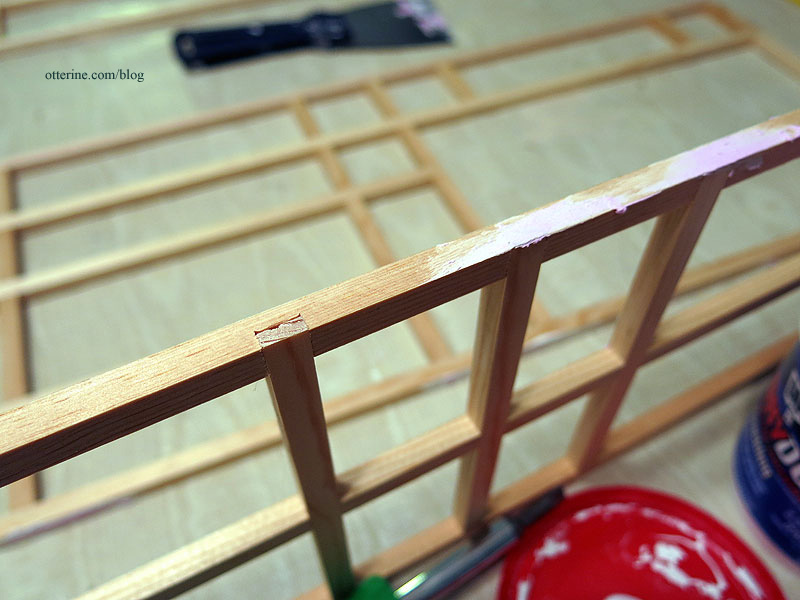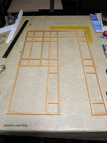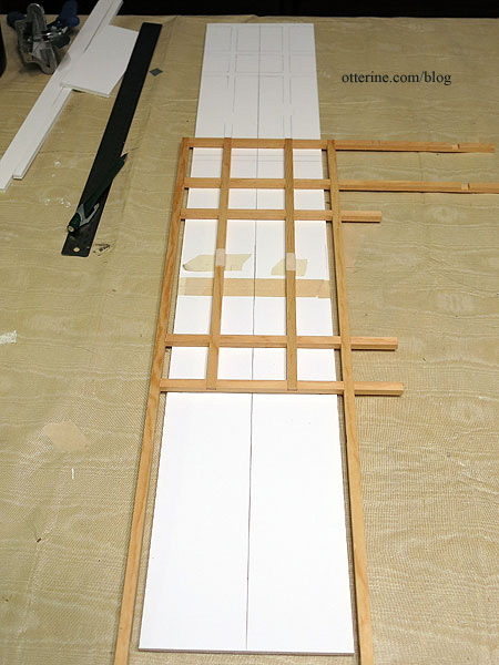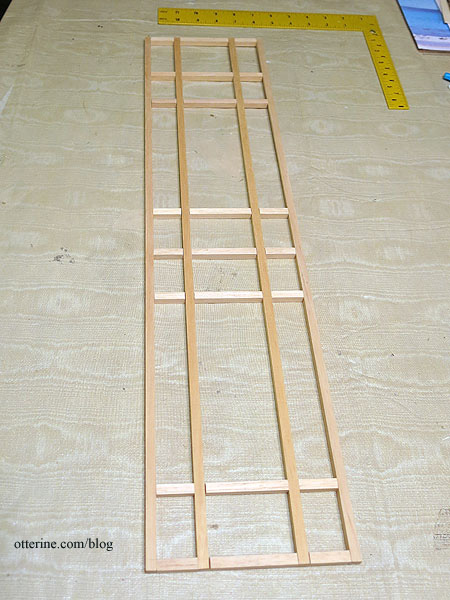 I cut new timbers from 5/16″ basswood and notched the center pieces like the original to help keep the grid even and secure.