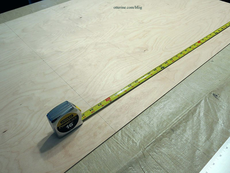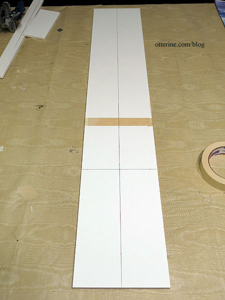 I measured out a box 16 9/16″ wide by 33 3/4″ tall, marking the 8 3/4″ dividing line between the grid and the lower stone finish. I had one shot at this, so I sat on the couch, emailed my friends, confused them with math, and measured three times. All good!