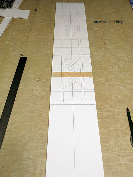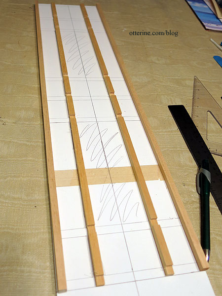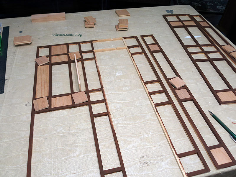 The side grid timbers will be 5/16″ wide as opposed to 11/32″ wide as on the facade, but I marked the entire original grid on the side board as a general guide.