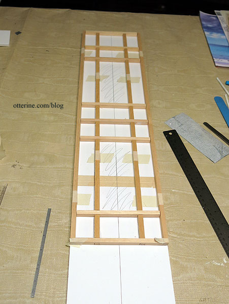 Continuing work on the timber grid. Since I plan to make the side addition in the same manner as the facade, I cut a foam core board mockup to configure the layout. After having some time to consider the overall construction, I added 1/4″ to the height of the facade, making the final measurement 17 1/4″ wide by 33 3/4″ tall. For the side addition, I made its front board 6″ wide by 33 3/4″ tall.