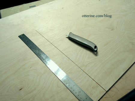 I slid my cutting board under the plywood on my work table. I used a utility blade for this part mainly because 1/8″ thick plywood doesn’t take that much effort to cut by hand.