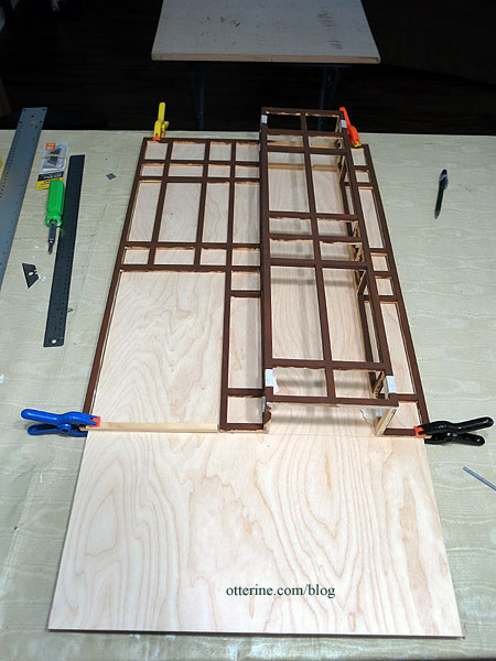 Inside, the grid creates an uneven surface that will need to be addressed after the windows are in place. I’m thinking 1/32″ thick veneer for a smooth wallpapering surface. There will also be trim work to finish the interior windows. All of my ideas are still floating around.