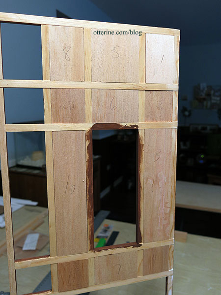 Next up – gluing the interior framing for all window openings, cutting new pieces as needed.