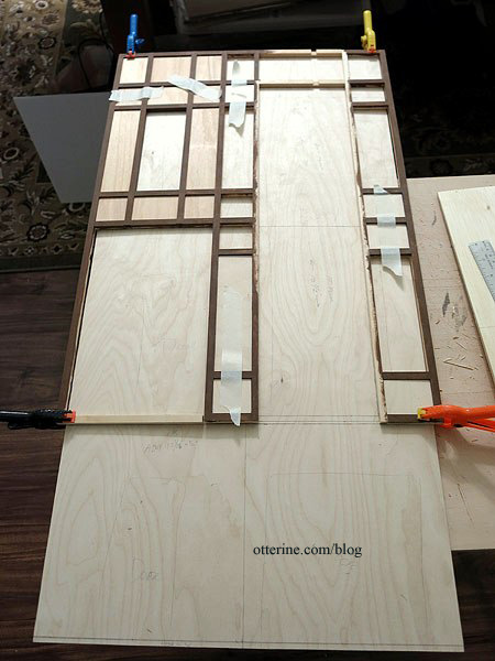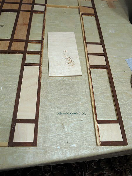 Continuing work on the bay window section. The glass is to be placed on top of the wood pieces and an identical set is glued in place over the glass to keep it secure, but I need to create the stained glass inserts first.