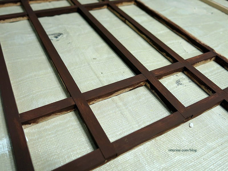 I painted the timber grid with a mix of Staining Medium and Bittersweet Chocolate by Americana. The previous base coat of Coffee Bean by Folk Art underneath created a subtle variegated color.