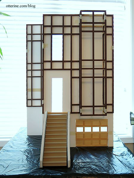 I didn’t paint inside the grid other than a bit around the edges and inside where the windows will be. There are filler pieces for the enclosed spaces, and only 1/16″ will show of the sides. I also left the beam under the front door unpainted for now.