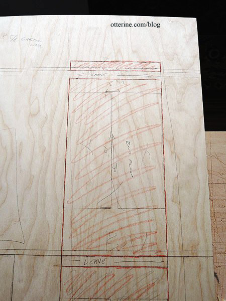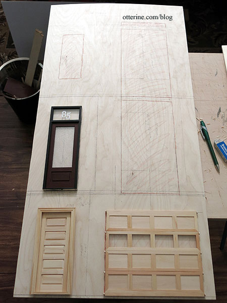 By far, the front board was the most complicated. I mapped out where the inner floors would hit as well as the openings for the bay windows, upper window, front door, lower level door and garage door. I still have to work on the front door recess before I can mark that final opening.