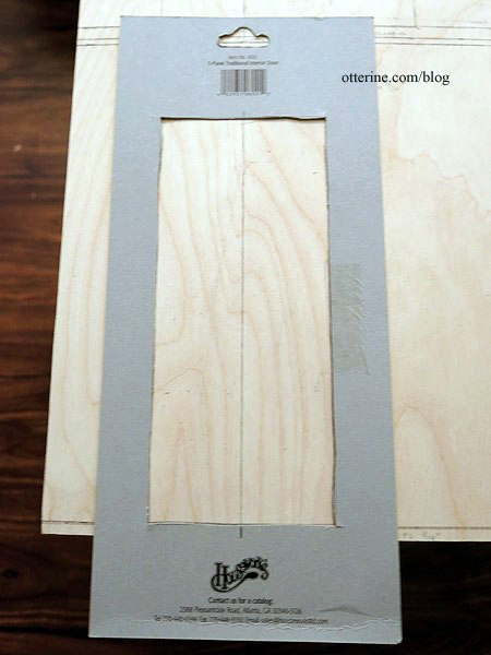 Houseworks doors come with a template on the package. To center the lower door under the main door, I marked the center line on the board and the template. I lined up the marks and traced the outline.
