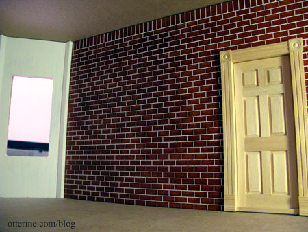 The walls are covered with two colors of scrapbook paper: Grenadine by Bazzill Basics on the top and Blonde Columns by ANW Crestwood on the bottom. The bottom paper has a vertical line texture that mimics wainscoting. The chair rail is made from skinny sticks. For the floor, I used a sheet of the same black hexagon tile I had used for the garage flooring treatment. The wallpaper is glued in place, but the trims are being held with Mini-Hold at the moment. I still need to cut the baseboards and touch up the trim pieces before gluing them in permanently. The rug is a scrap of silk wallpaper.