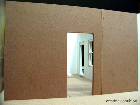 In order to have the ability to put items closer to the back edge, I cut the main single-door room divider on the opposite side into two pieces and then glued them back together to have the door opening in the middle. I used spackling to smooth out the seam so it wouldn’t show under the wallpaper.