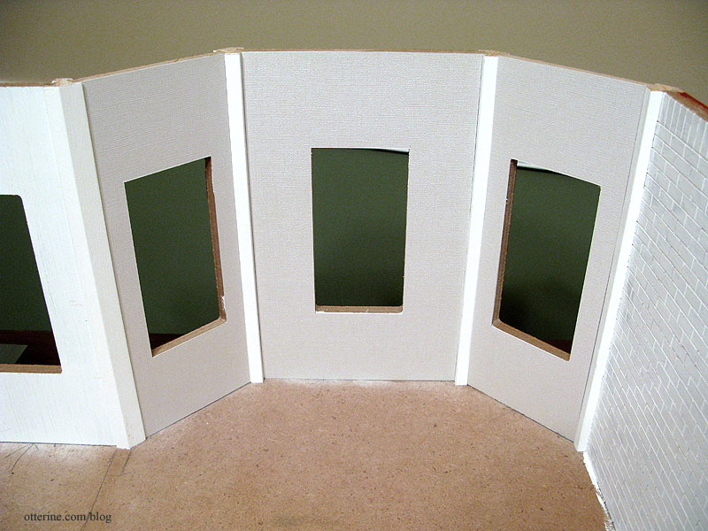 For the walls, I used the same scrapbook paper as the garage: Swan by Martha Stewart. It’s a very pale green and allows for just enough contrast with the white wood trim. It’s also one of the few papers I’ve found that is larger than 12 inches square; that means no seaming! :D Ah, it’s the little things…. Unfortunately, the store where I got it no longer carries that size.