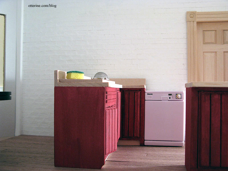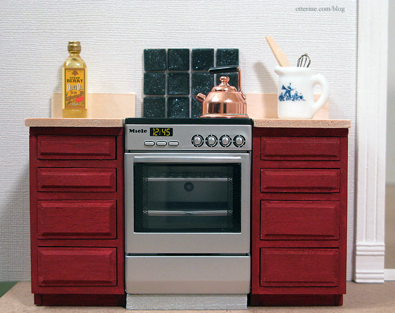 I used two base cabinets by Houseworks with four drawers on either side of the oven.Since the drawer cabinets come from a different manufacturer, I had to make a few adjustments to make them blend with the Euro Mini’s. I added a front baseboard, a thin strip of wood above the top drawer to make the front flush and cut a countertop with a backsplash.