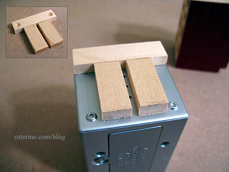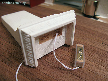 I used a small piece of bass wood painted gloss white to mimic the outlet cover. For the “open” outlet, I drew on the outline, indented it a bit with an X-Acto knife and then brushed a bit more paint over the drawing. On the other side, I made a hole to feed the lamp wire through.