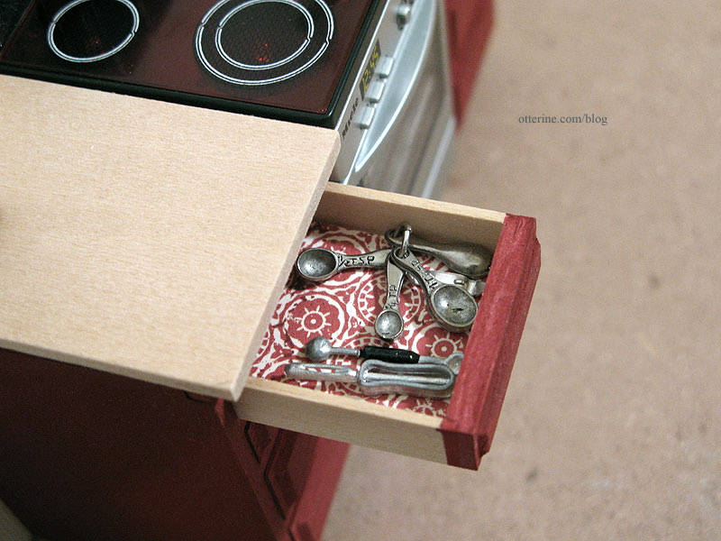 One thing I like most about this miniaturist hobby is putting in hidden elements. They aren’t necessary to make the overall room look realistic, but they are fun to add. I used scrapbook paper from BasicGrey called Vintage Tee to mimic contact paper in the drawers.