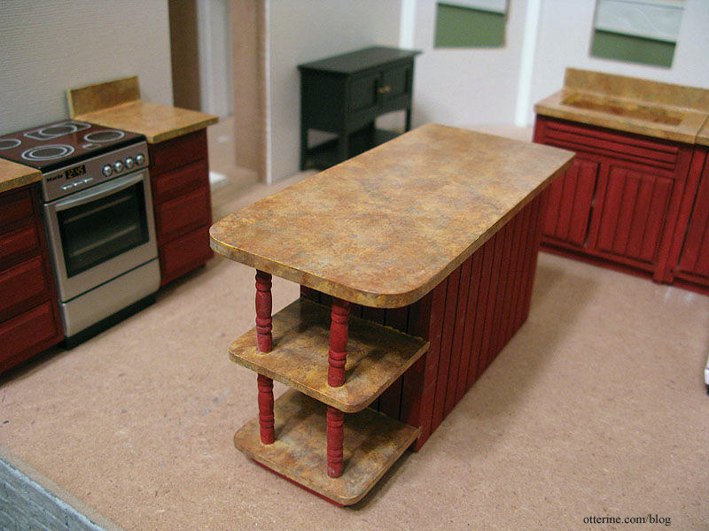 I wanted to do a faux granite finish for the countertops, so I used the technique shown in the DVD by Master Miniaturists called Faux Finishes.