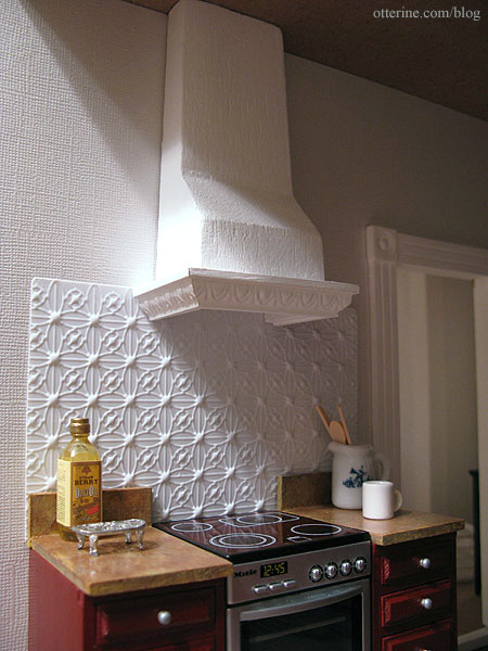 Originally I was going to make upper kitchen cabinets and a range hood for this side of the kitchen. But, after making a mockup of the range hood, I decided I liked it on its own. The range hood is made from a block of balsa and decorative wood trim. I built a lip on the bottom of the balsa base so it would look like there was a vent. I searched for more ideas online and found some nice images of tin ceiling tiles used as a backsplash. It seemed like something fairly easy to replicate since Houseworks makes a sheet of vinyl molded to mimic tin ceilings.