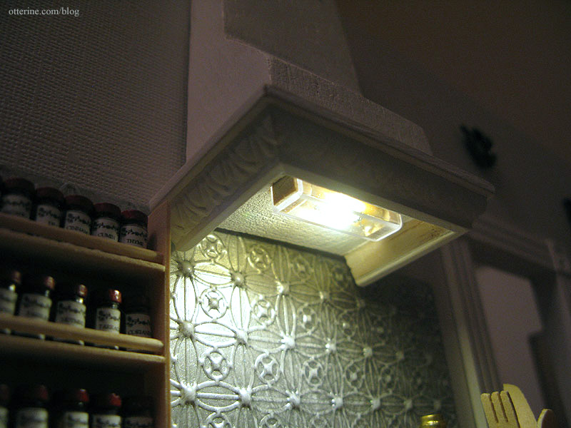 I had built a lip on the bottom of my range hood to give a more realistic look and to have room to add a light. I chose an LED strip in warm white by Novalyte, cutting a rough hole in the balsa to hold the light in place. These lights are compatible with 12V dollhouse lighting. I drilled a hole through to the back; the wires will run through the wall and plug into the power strip.