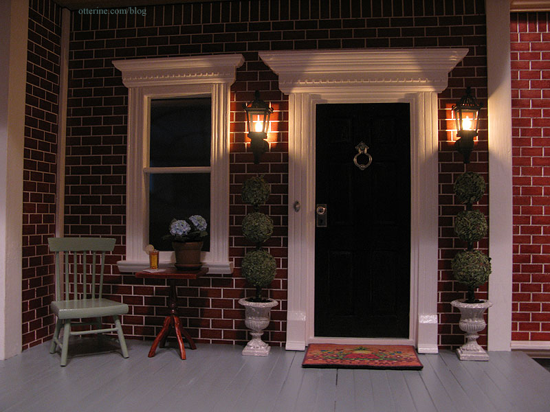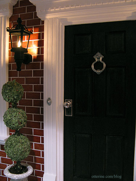 The doorknocker is by Olde Mountain Miniatures; the iron was a little dark for the door so I brushed on a light coat of metallic silver paint. I don’t recall where the doorbell came from, but it was brass. I painted it silver with a dab of white on the button. It doesn’t ring, though there are musical doorbell systems for dollhouses on the market.
