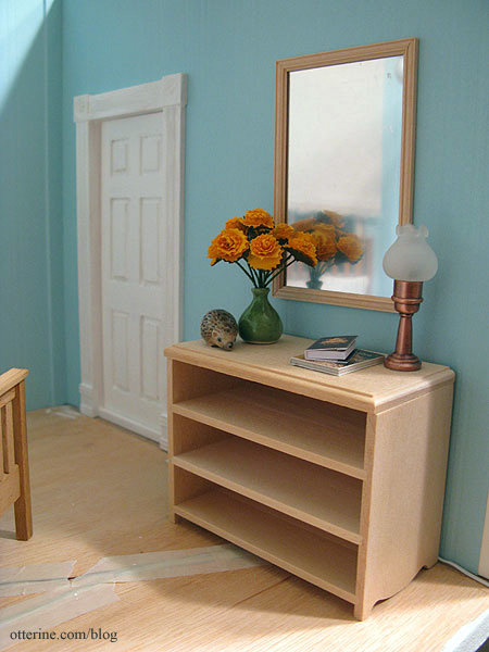 I used some leftover IKEA stain for the front door, finishing it and the white doorframe and window with satin varnish. The doorknob and doorplate are by Clare-Bell Brass and came in chrome finish. I wish more minis came in silver and chrome finishes instead of only brass.