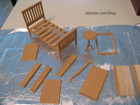 I used balsa wood for the build since I am not sure where I would find the obechi wood the book indicates. Balsa can damage easily, but I love the way it looks once stained. It’s also very easy to cut. (Note from the future – I would no longer use balsa to build, and this bed has suffered damage over the years.)