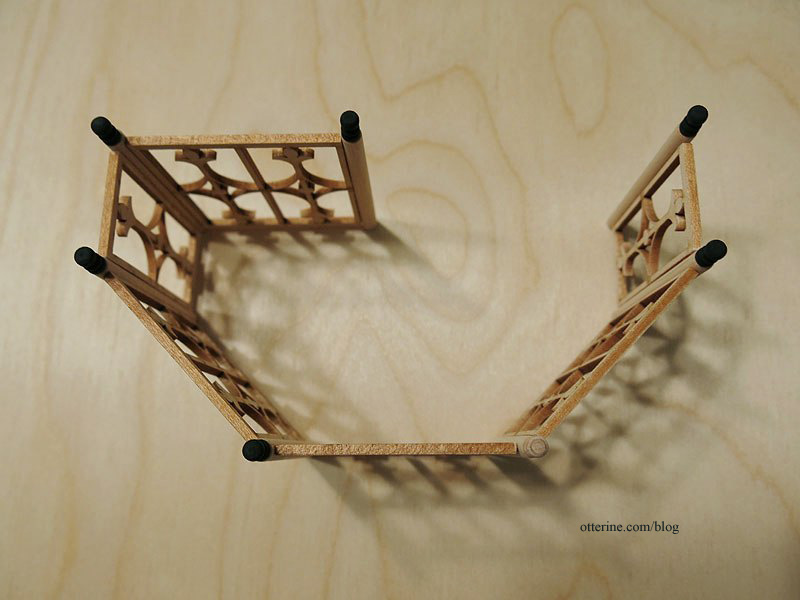 I cut 2 5/8″ high posts from 3/16″ Woodsies dowels and topped each one with a detail trimmed from spindles by Tiny Turnings.