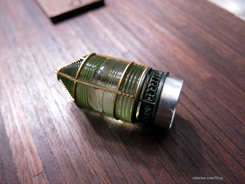 Bill fashioned a new magnifying glass from a Canon camera viewfinder lens, brass tubing and a belaying pin. Fantastic! He said I needed chart dividers, too. These actually function! You open them by squeezing the rounded parts. There’s also a spyglass.