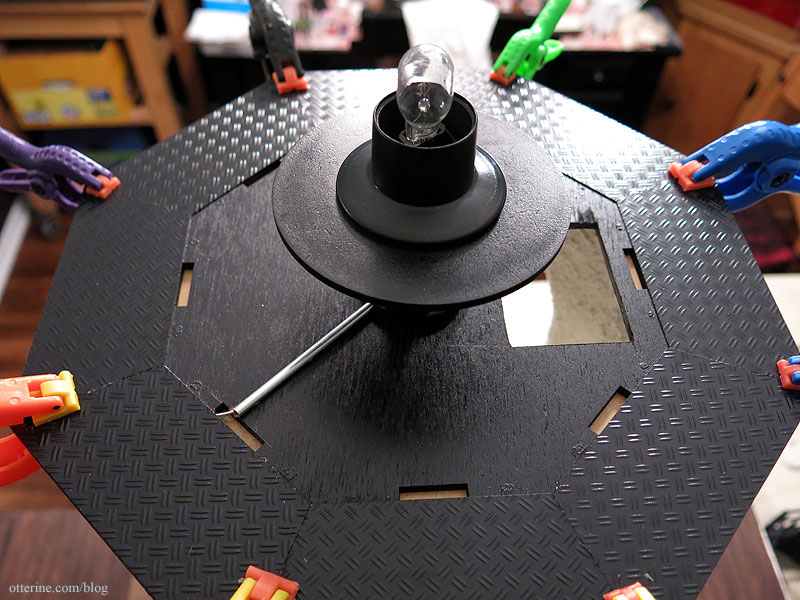 I built a support mechanism for the lens from a kitchen spray hose guide from Home Depot and some mdf circles from the scrapbook aisle at Michaels. You should have seen me wandering around Home Depot just looking at all the components in the plumbing and electrical aisles. I must have been asked a dozen times if I was sure I didn’t need help. I wanted something that looked mechanical and gave the illusion of having the ability to rotate.
