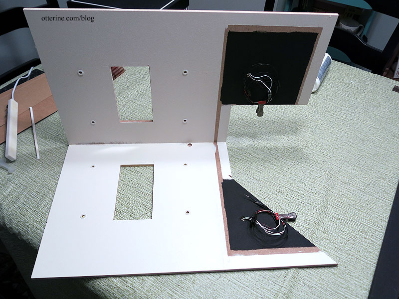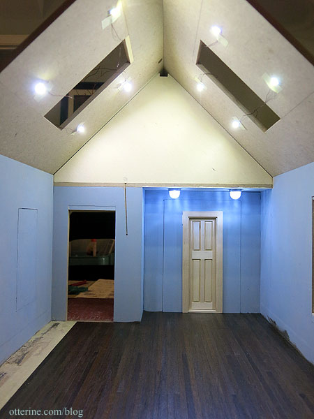 I painted the front gable portion black. You can also see the wiring for the ceiling lights curled and clamped for later work.