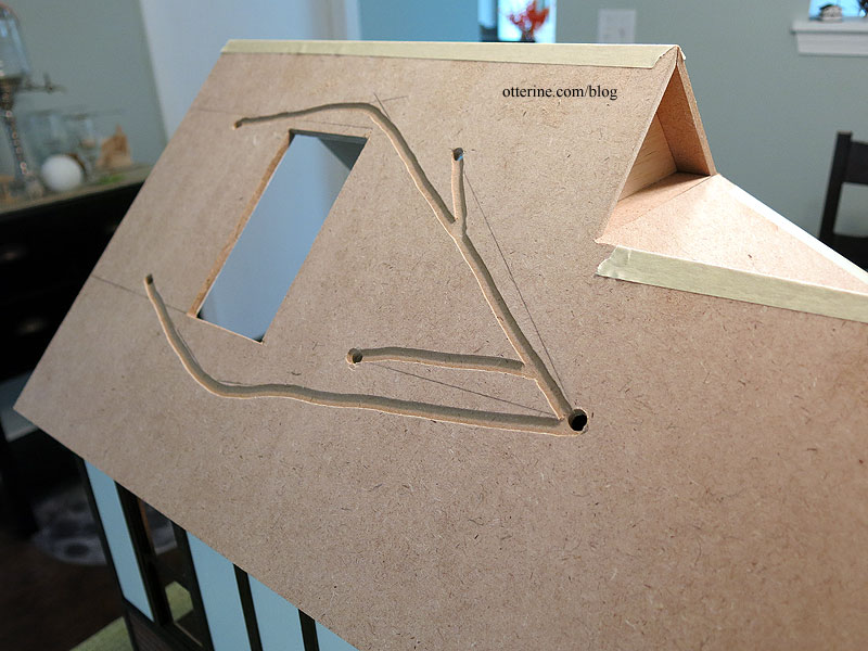 I then made my wiring channels for the recessed ceiling lights using a Dremel Trio. After, I taped the two roof boards while flat, added glue and then folded the boards. I used my carpenter’s square and a triangle to hold the boards in position while the glue dried. I left the tape in place on the exterior for stability and will remove it once I’ve installed the board onto the structure. The two smaller roof boards are still in dry fit.