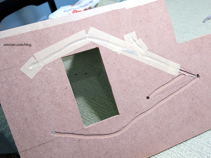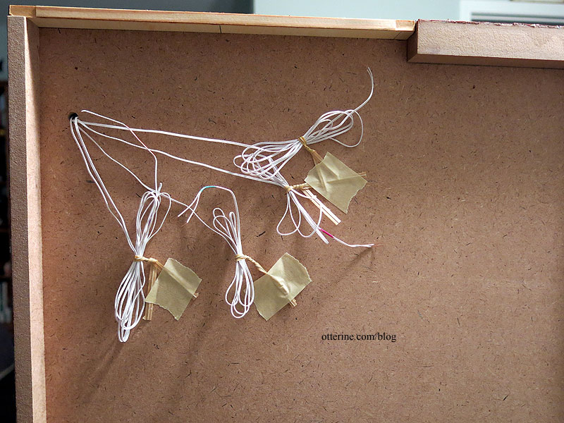 I have some of the wires that will extend to the power strip in place. These have been bundled under the structure for later use when I attach the building to the landscaping board.