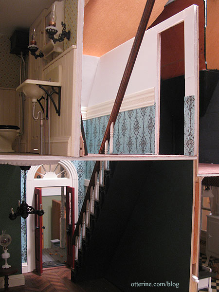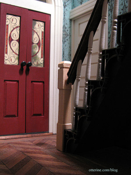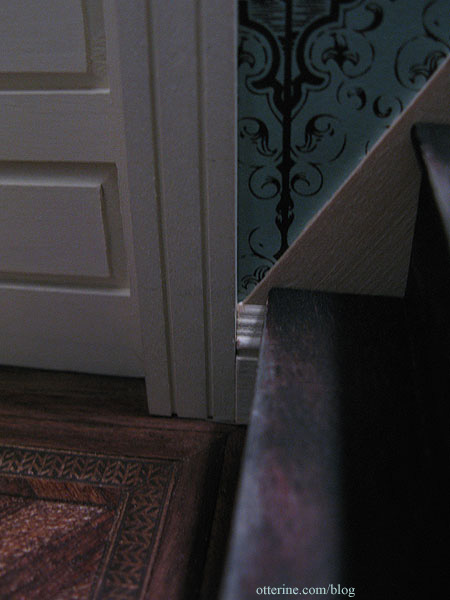 At the base of the stairs, the stringer meets the baseboard trim. Here the stringer is shown before finishing. This is one of my favorite views of this house that can be seen only with a camera.
